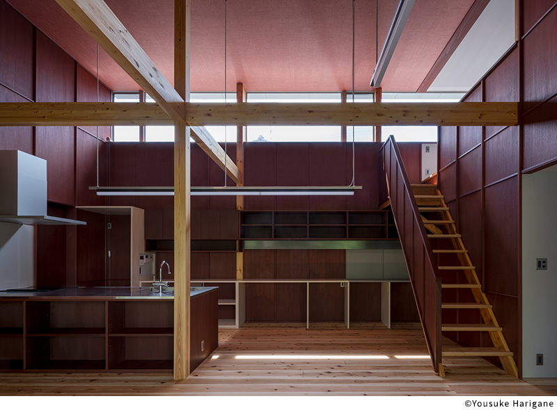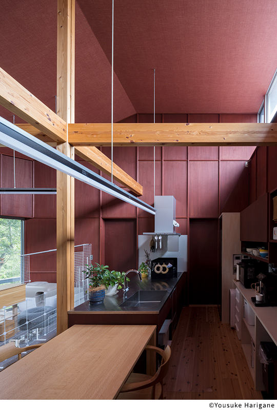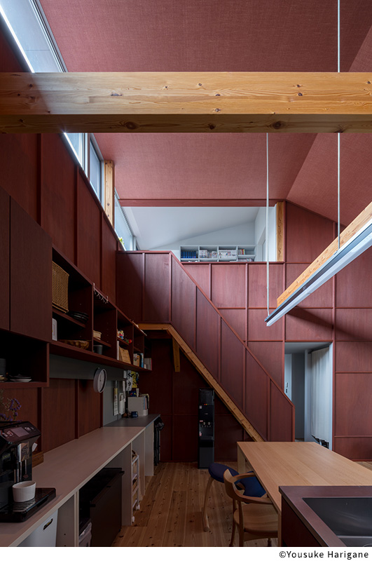 この割切れない譲歩から生み出されたゆらぎが、内壁を走る押縁の非均質な割付けとして表れてくる。