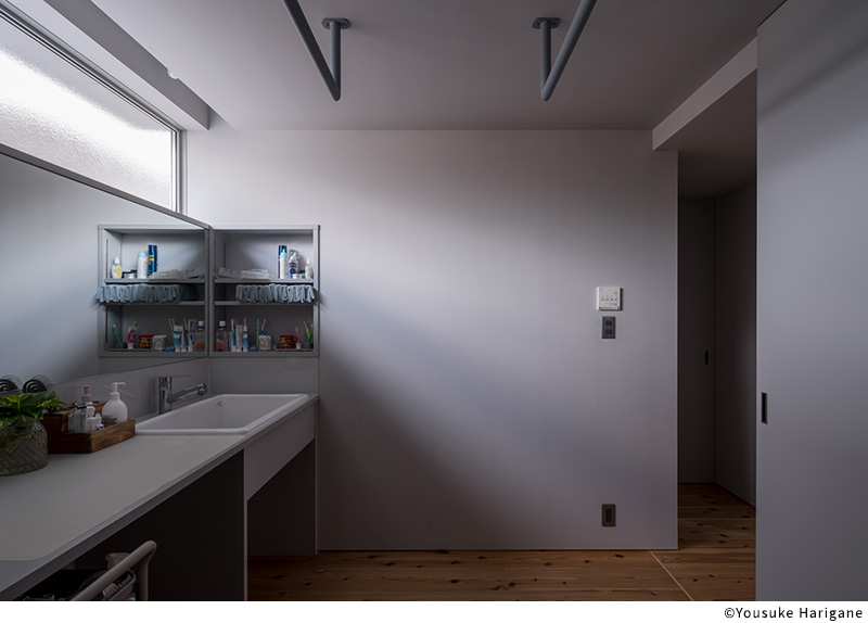 施主夫婦のモデュロールから生活寸法をつくり、これに空間を呼応させてゆく。人体寸法は個体差が大きく非均質であり、生活習慣や癖も各々個性があって均質に揃えるのは難しい。しかし現在の住空間は、工業製品からなる建材寸法の反復がもたらす均質要素が強く、個体差を後回しにするようなぎこちなさを感じてしまう。