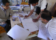 数十枚にも渡る詳細図を持って来られていた。陶山さんと意見を交わしながら、形や素材、器具などを決めて行く。木工屋さんは木工のプロとして、陶山さんは建築のプロとして、それぞれ一家言ありそうで面白かった。予算は限られているが、良い家具ができそうで楽しみ。