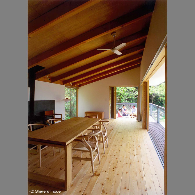 計画敷地は、遠くを望むすばらしい山並の景観と共に、敷地内の木々の緑も美しいものがあります。ここでは、これら2つの自然を同時に楽しむことができるように、リビング空間を空中に持ち上げた「地上2メートルのリビングルーム」を提案しています。