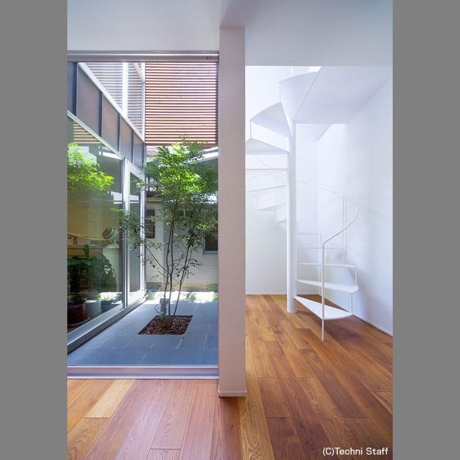 核家族を対象としたこの住宅において中央のガラスの光庭は光を取り込むだけでなく上階下階の家族の気配を感じ取る軸となって存在している。外部の視線を気にする事のないLDKはスキップフロアとする事で一つの空間でありながら領域を区切り、そこに設けられた大開口の窓から食事をしながら、寛ぎながら、目線を変えて神社の緑を借景として楽しめる仕掛けである。