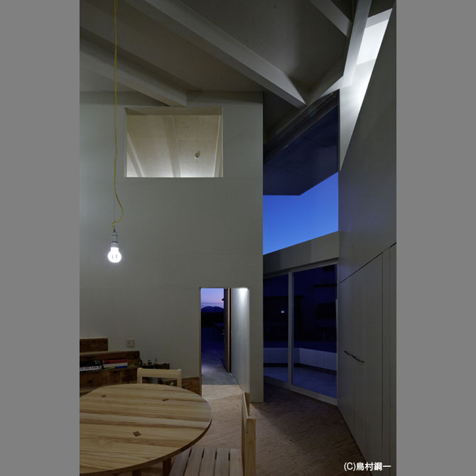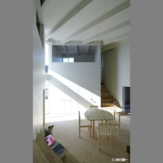 「リビングは必要ないんです」というこの家族にとって、「食卓が家族の中心」であり、また、「それぞれの気配を感じながらバラバラに時間を過ごすことが日常である」と話す彼らは、この場所にたくさんの居場所を手に入れることを望みました。最終的には、この敷地が面する近隣に等しく向かい合い、住宅の全ての居室からダイニングを望むことができる状態で完成しています。