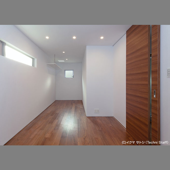 建物中央に中庭・吹抜を配置し、各室に効率的に光を確保できる『光のたて穴』を設けた。これは、下階から上階、そして空へと空間が「たて」に継り、外部の視線をカットしながら、風や光を内部へ取り込める仕掛けだ。更にここで取り込んだ光は、「たて」だけでなく「よこ」へ拡がり、家族の繋がりと空間の拡がりへの役割も果たしている。