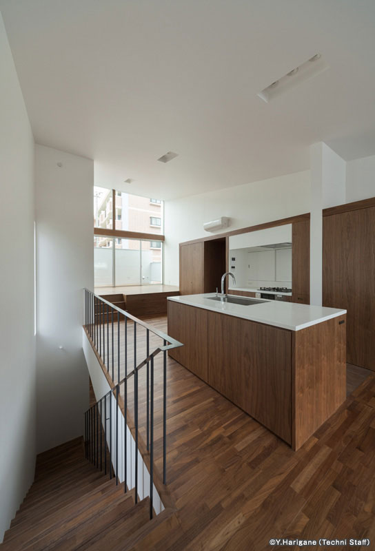 敷地は街中の住宅地にあり、南側はマンションが立ち並ぶものの、北側には小学校の校庭があり、眺望には恵まれていました。敷地面積は28坪と小さく、広がりをどのように確保するかが1つの課題でした。