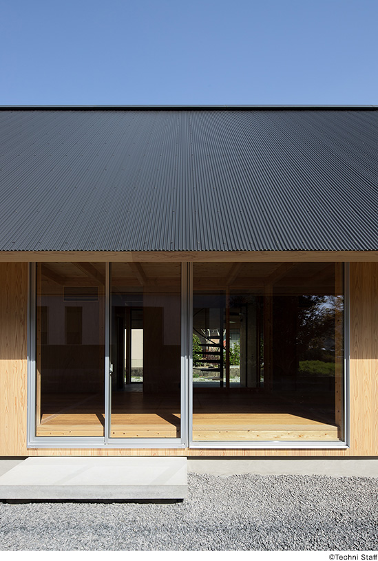 田園風景が望める南側は室内化された土間、北側はガレージや作業場として外部化された土間とし、環境の良い周囲に対して開いた構えとしています。