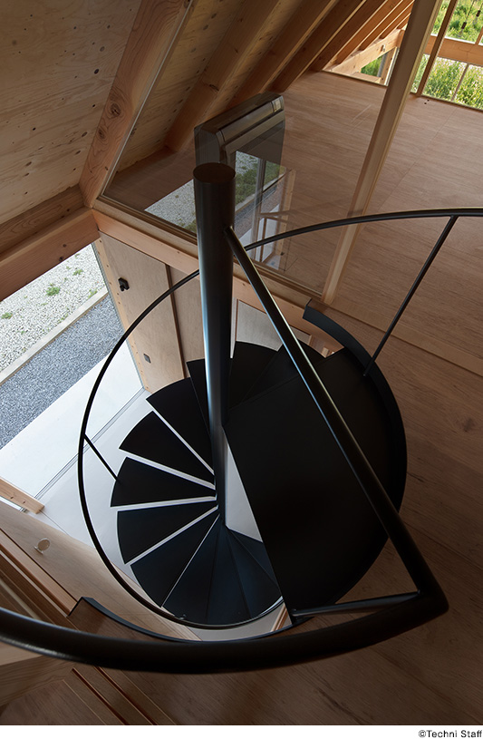 また、三角形の断面形状は登り梁のスラストを抑える合理的な形状にもなっており、中央の束柱を省略し、最大限の気積を確保しています。これは農家建築の小屋組に見られる叉首構造を参考にしており、大きな気積の屋根形状が周囲の田園風景と親和性のある景観になることを意図しています。